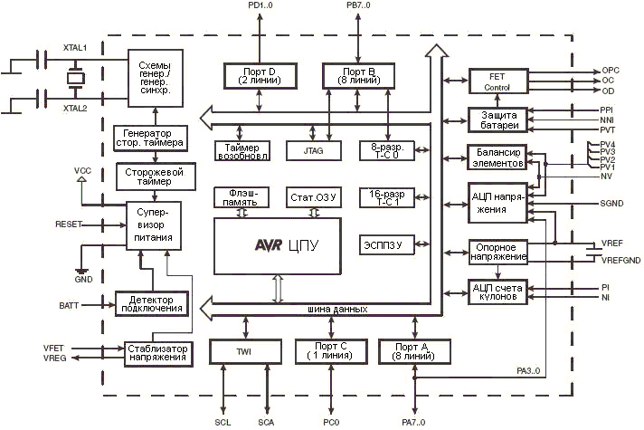 ATmega406 содержит следующие блоки: стабилизатор напряжения, автономная схема защиты батареи, встроенные полевые транзисторы для балансировки элементов батареи, высоковольтные аналоговые входные цепи и микроконтроллер с двумя АЦП для контроля уровня заряженности батареи с общим прецизионным источником опорного напряжения.