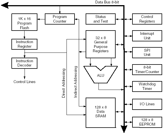 Ядро AVR содержит мощный набор инструкций и 32 рабочих регистра общего назначения. Все 32 регистра напрямую подключены к арифметико - логическому устройству (АЛУ), что обеспечивает доступ к двум независимым регистрам при выполнении одной инструкции за один такт. В результате, данная архитектура имеет более высокую эффективность кода, при повышении пропускной способности, вплоть до 10 раз, по сравнению со стандартными микроконтроллерами CISC.