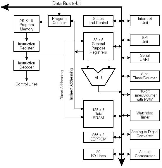 Ядро AVR содержит мощный набор инструкций и 32 рабочих регистра общего назначения. Все 32 регистра напрямую подключены к арифметико - логическому устройству (АЛУ), что обеспечивает доступ к двум независимым регистрам при выполнении одной инструкции за один такт. В результате, данная архитектура имеет более высокую эффективность кода, при повышении пропускной способности, вплоть до 10 раз, по сравнению со стандартными микроконтроллерами CISC.
