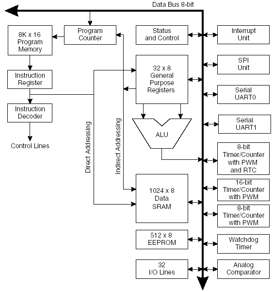 Ядро AVR, основанное на усовершенствованной RISC архитектуре, содержит мощный набор инструкций и 32 рабочих регистра общего назначения. Все 32 регистра напрямую подключены к арифметико - логическому устройству (АЛУ), что обеспечивает доступ к двум независимым регистрам при выполнении одной инструкции за один такт. В результате, данная архитектура имеет более высокую эффективность кода, при повышении пропускной способности, вплоть до 10 раз, по сравнению со стандартными микроконтроллерами CISC.