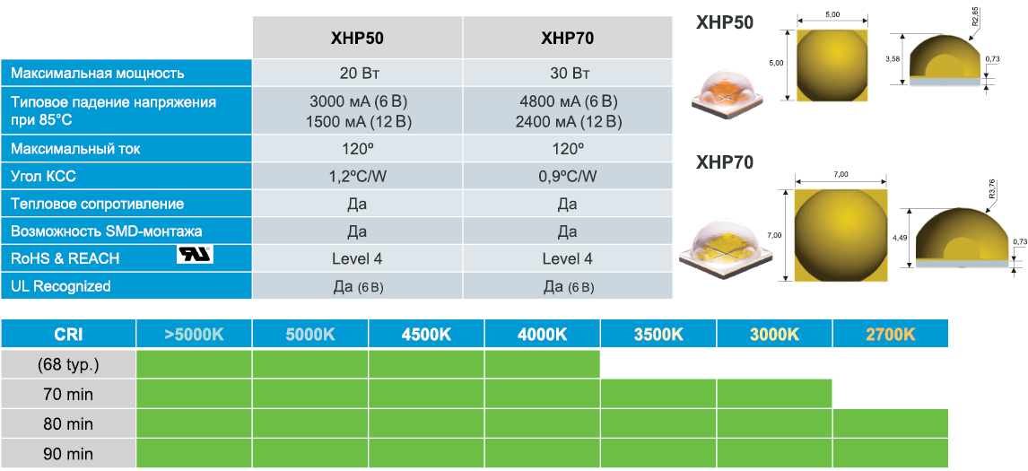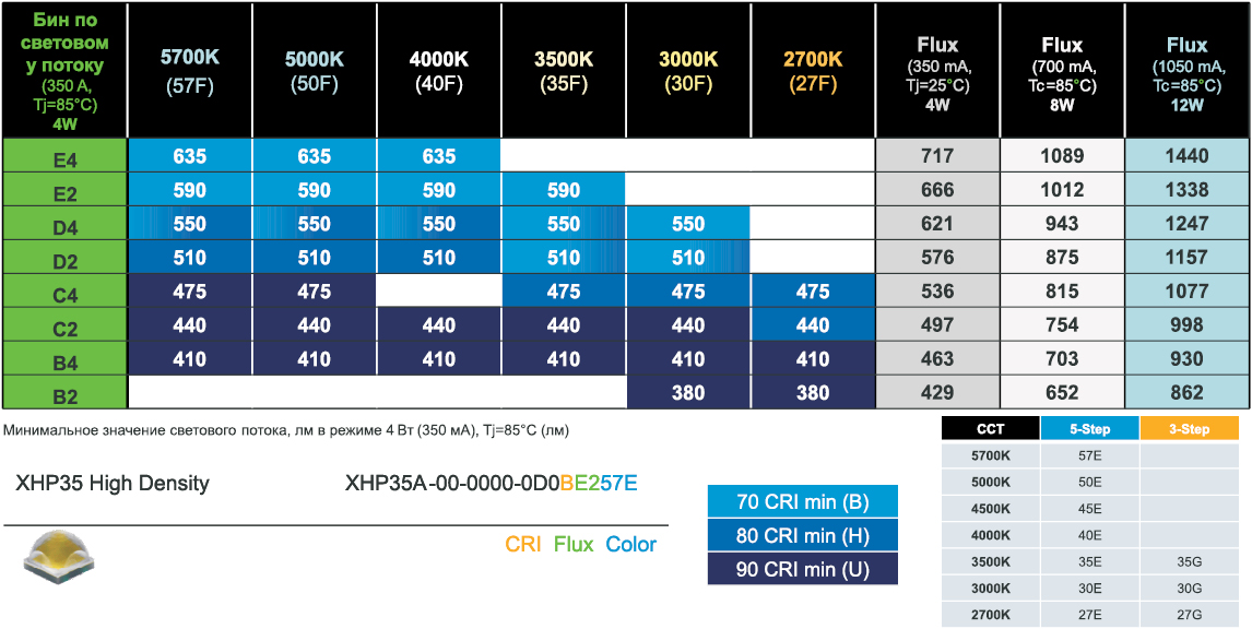светодиодов и доступные для заказа комбинации ССТ/CRI серий XHP50 и