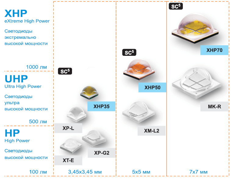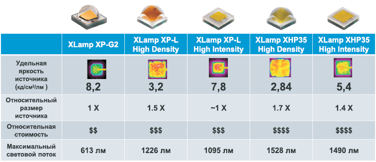 версий HD и HI и светодиодов предыдущего поколения – XP-G2, XP-L.