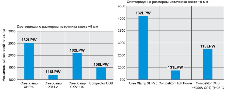 и эффективности светодиодов XHP50 и XHP70 по сравнению со светодиодами