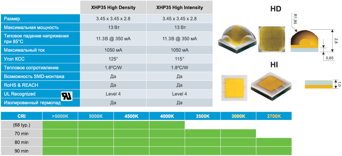 оптических параметров светодиодов XHP35 версий HD и HI и светодиодов