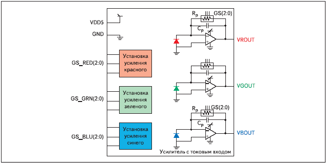 зеленого и синего фильтров и трех усилителей с токовым