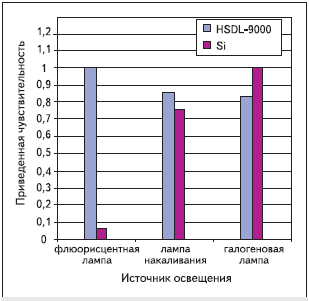 видно, что рабо та устройства сильно зависит от типа источника света и