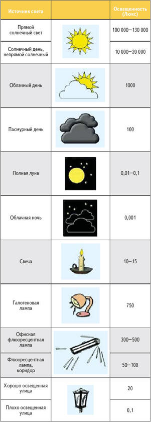 различных источников света. Уровень освещенности в реальных помещениях изменяется
