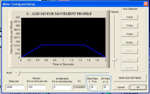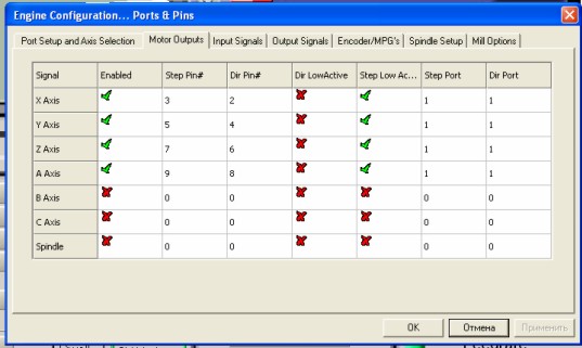При настройке программного обеспечения рекомендуется установить ширину шаговых импульсов 20-25 мкСек и поставить инверсию сигнала (для программы MACH 2(3) эти настройки находятся в меню Port and Pins и Motor tuning ).