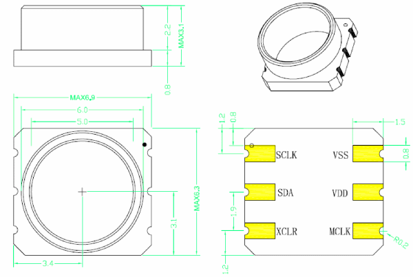 Модуль HP03MA имеет компактное текстолитовое основание (6.9x6.3x3.1mm) для автоматического монтажа и рассчитан на температурный диапазон: −20°C…+60°C.