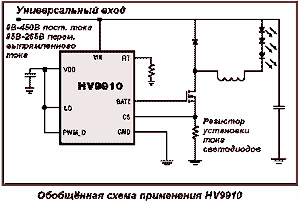 мощность нагрузки управляется внешним MOSFET транзистором на фиксированной частоте до 300 КГц. Использование HV9910 обеспечивает гибкость управления светодиодами и увеличивает срок их службы.