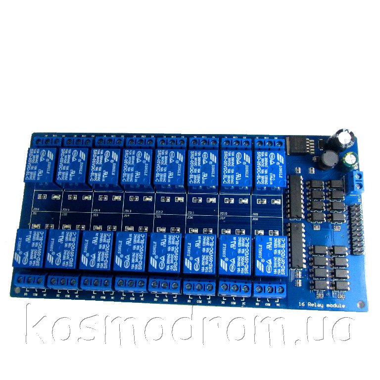 16-ти канальный релейный модуль, который может управляться контроллерами Arduino, 8051, AVR, PIC, DSP, ARM, ARM, MSP430, TTL logic или с помощью компьютера.