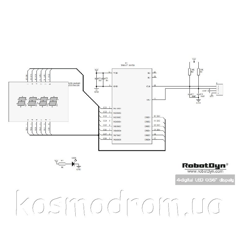 Модуль основан на драйвере TM1637. Чип может обмениваться данными с