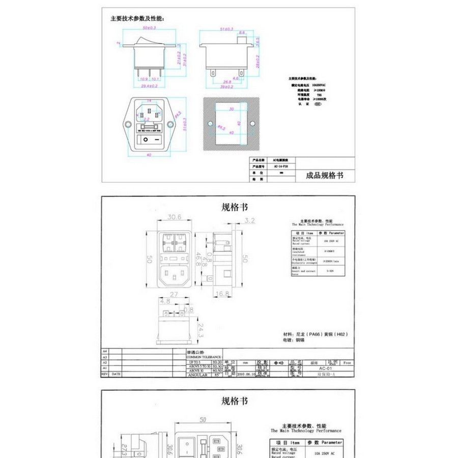 AC-14-F18 Представляет собой сетевую приборную колодку трёхконтактной розеткой для сетевого кабеля, выключателем и отсеком для предохранителя. Применяется в бытовой и промышленной аппаратуре. Крепление осуществляется двумя винтами.
