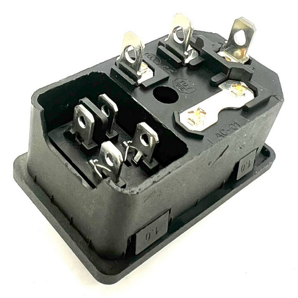 Разъем питания 3 контакта, с выключателем и отсеком для предохранителя. Цвет выключателя: красный. 250 В. 10 А. С подсветкой. Защелки: 1 мм.