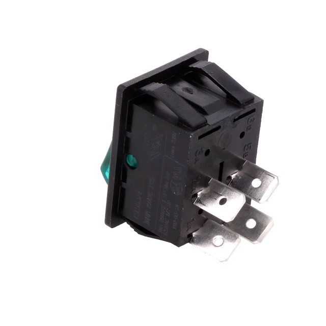 Фото может отличаться от реального вида предмета, но это не влияет на основные характеристики изделия | Микропереключатель рокерный AE-C1553ALNBV ROCKER, DPST, Поз: 2, ON-OFF, 16A/250ВAC, зелений, неон.ламп, 250В