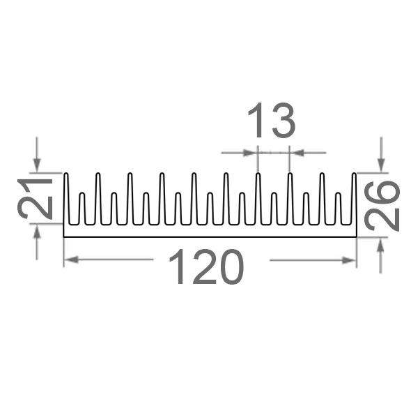 Фото может отличаться от реального вида предмета, но это не влияет на основные характеристики изделия | Радиатор ребристый алюминиевый ALPR-050X120X26 Радиаторный профиль, без покрытия, Периметр - 859 мм, Сплав АД31Т5, Вес 1 м.п. - 3,425 кг, Размеры: 050Х120Х26 мм, Площадь: 257,7 кв.см