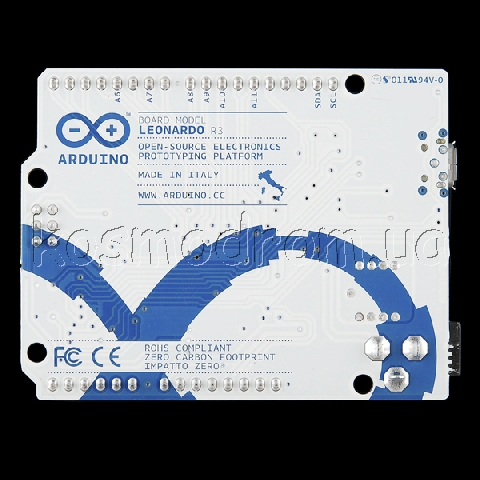 Размер печатной платы Leonardo составляют 6.9 на 5.3 см. Разъем USB и силовой