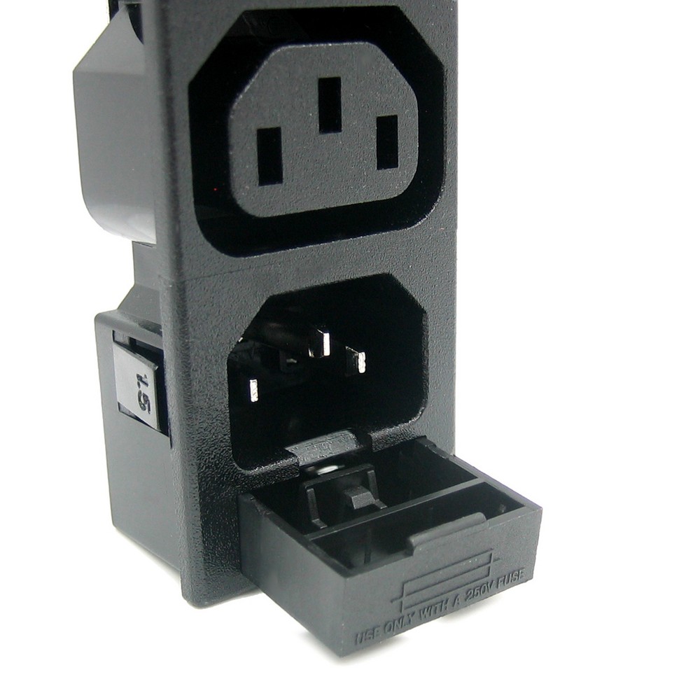 Разъем IEC 320 C13+C14. 220В. вилка/розетка, на блок, 3 контакта, крепление защелка. Количество секций вилка: 1 Количество секций розетка: 4. С отсеком для предохранителя