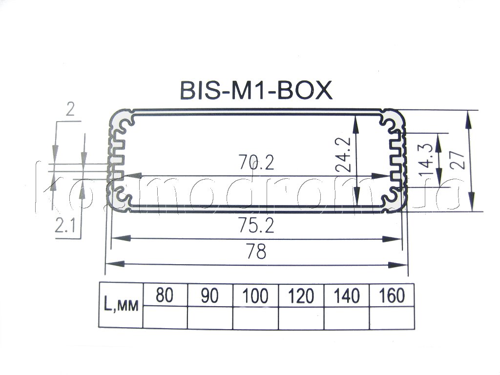 Фото может отличаться от реального вида предмета, но это не влияет на основные характеристики изделия | Корпус BIS-M1-BOX-100-01GR Корпус алюминиевый, анодированный, с пластиковыми крышками, размеры (ДхШхВ): 100х78х27мм. Цвет крышек: серый