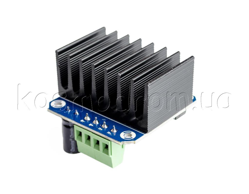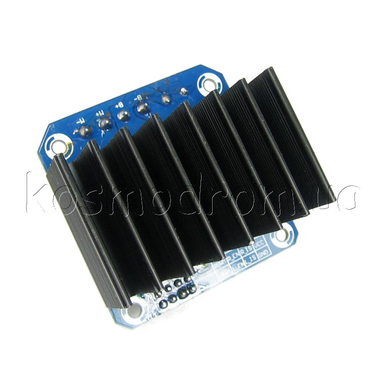 Модуль поддерживает управление двигателем с помощью ШИМ при максимальной частоте 25 КГц, имеет защиту от короткого замыкания, перегрева и превышения выходного напряжения.