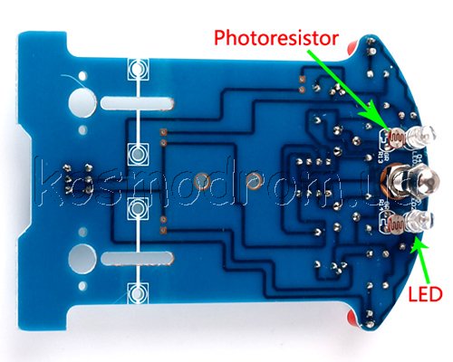 На плату устанавливаются 2 фотосенсора, позволяющие отслеживать линию, благодаря этому Car Intelligent Tracking Line может ехать по линии. Когда один из сенсоров заезжает на черную линию, соответствующий электромотор останавливается и робот начинает поворачиваться, выравнивая свое положение. После того как оба сенсора снова находятся над белым полем, робот продолжает свое движение вперед.
