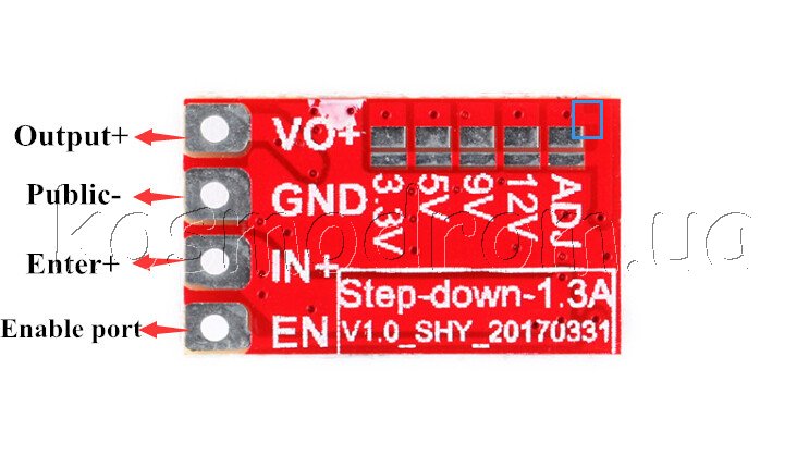 По умолчанию выходное напряжение 5 В. Если Вам нужно другое напряжение, удалите перемычку "обозначенную в синем прямоугольнике" на фото. И установите на нужное напряжение