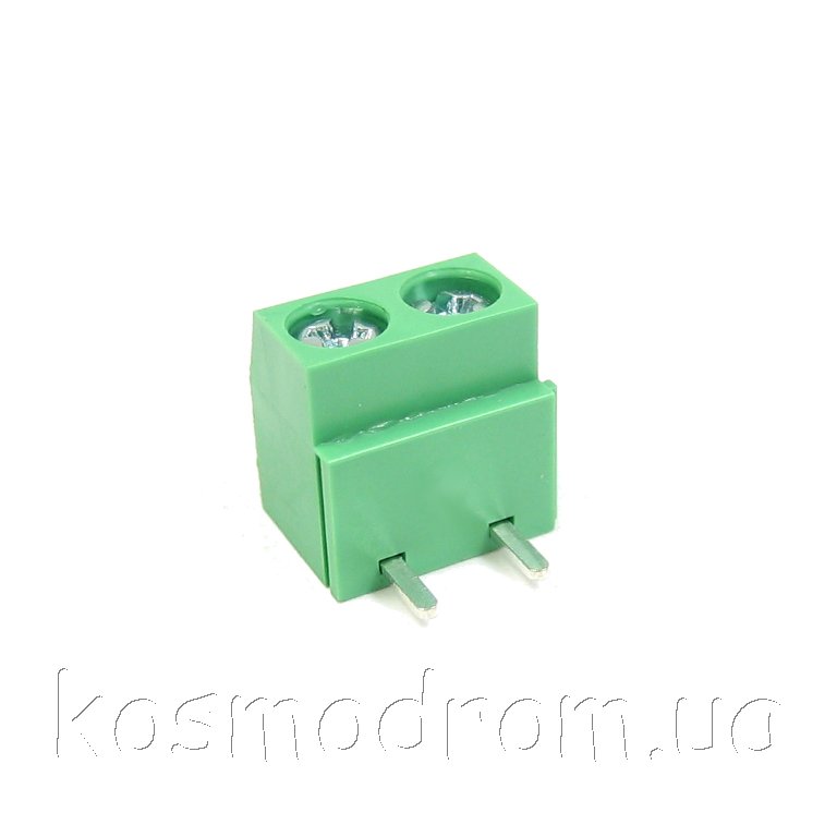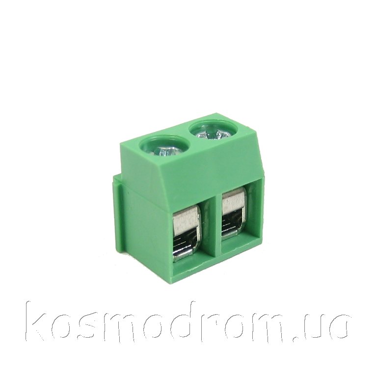 Клеммник винтовой,угловой с защитой провода, шаг 5мм.контактов 2:300В.10А. зеленый