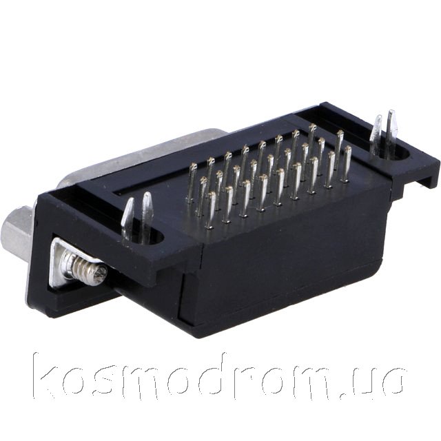 Разъемы стандарта D-SUB, трёхрядные, высокой плотности, для монтажа в плату под углом 90 градусов. Используются очень широко в компьютерах (VGA, SVGA). Разъемы серии D-SUB (полное название D -Subminiature) состоят из контактной колодки со штыревыми контактами в два, три или четыре ряда причем количество контактов в первом ряду на один больше, чем во втором. Контакты разъема защищены металлическим кожухом, напоминающим по форме букву D, благодаря чему исключается возможность неправильного соединения.