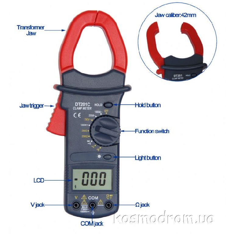 Тестер DT201C - Токовые клещи (цифр+темп) предназначен для измерения переменного тока без разрыва цепи. Также мультиметром можно измерять напряжение до 1000В, сопротивление и прозванивать целостность проводки и полупроводниковых приборов.