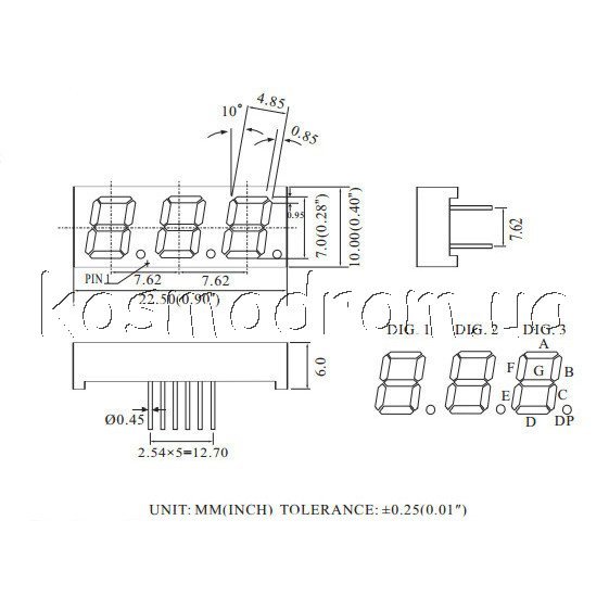 Индикатор относится к линейке трехсимвольных семисегментных индикаторов с высотой символа