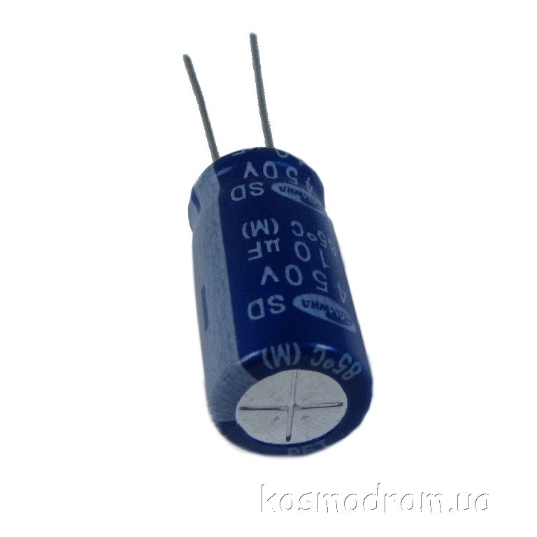 Конденсатор электролитический: 10 мкФ, 450 В. Диаметр 10 мм. Высота 20 мм SD2W106M10020PA