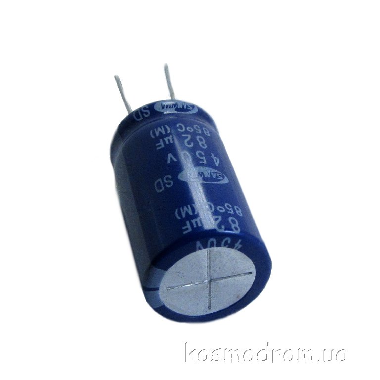 Конденсатор электролитический: 82 мкФ, 450 В. Диаметр 18 мм. Высота 31 мм