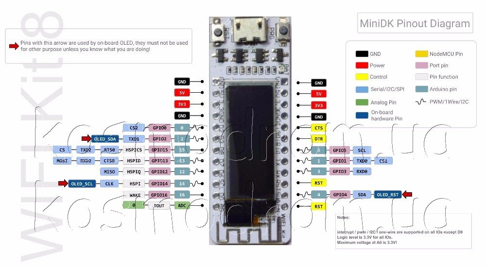 Основным чипом является ESP8266, Микросхема ESP8266 представляет собой не только беспроводный приемо-передатчик по стандарту Wi-Fi но и полноценный микроконтроллер. Встроенная 32MByte Flash, Wi-Fi антенна, 0,91-дюймовый OLED-дисплей, CP2014 USB интерфейс, поддержка среды разработки Arduino и NodeMCU.