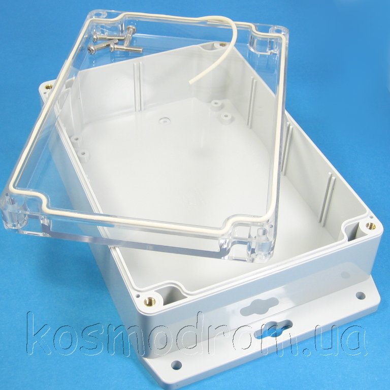 корпус с прозрачной крышкой и фланцем серого цвета с фланцами для настенного
