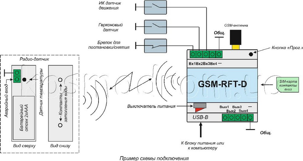 Модуль GSM-RFТ-D позволяет: 1. Работать с 9-ми “своими” абонентами. 2. Наличие радио-модуля для обмена данными с радио-датчиками,