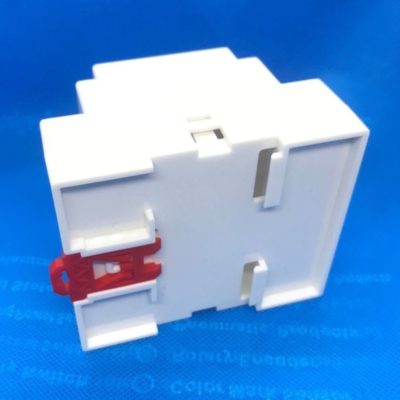 Пластиковый корпус на DIN рейку светло серого цвета. Из ABS пластика. Габаритные размеры составляют: по длине 72 мм, по ширине 88 мм и по высоте 59 мм.