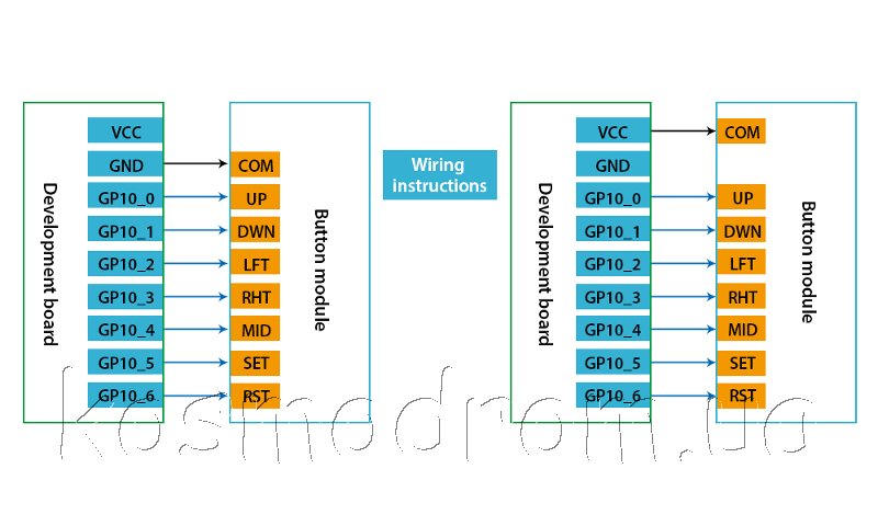 Управления осуществляется по 5-ти положениям (вверх, вниз, влево, вправо, центр), на плате джойстика установлены две кнопки (SET и RESET).