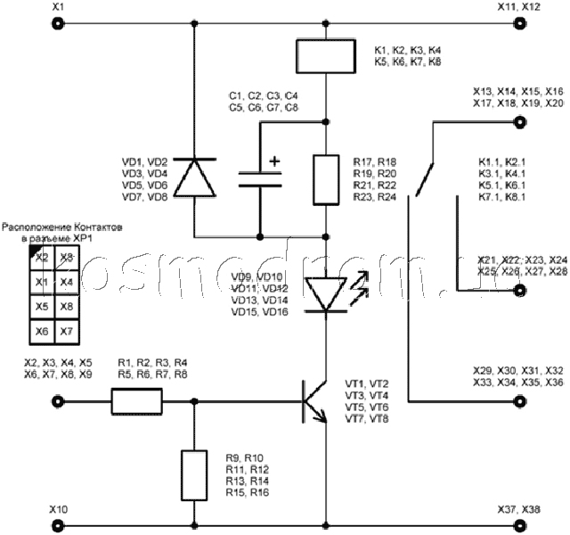 Все восемь каналов блока реле выполнены по идентичным схемам. Каждый канал