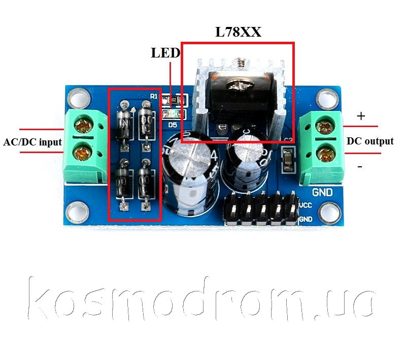 Понижающий модуль на основе регулятора напряжения L7812. Компактные размеры делают его удобным в использовании, а встроенный радиатор охлаждения позволяет получать выходной ток до 1.2 Ампера.