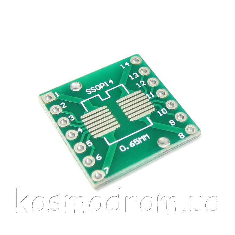 Фото может отличаться от реального вида предмета, но это не влияет на основные характеристики изделия | Макетная плата - адаптер MAKET-PCB-SO14xTSSOP14-DIP Универсальная двухсторонняя макетная плата, переходник с корпусов SOIC14, SOP14, TSSSOP14, с шагом 0,65 и 1,27 мм. на DIP14