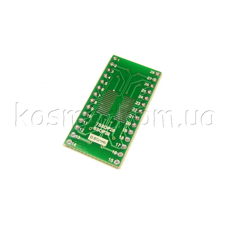 Фото может отличаться от реального вида предмета, но это не влияет на основные характеристики изделия | Макетная плата - адаптер MAKET-PCB-SO28xTSSOP28-DIP28 Универсальная двухсторонняя макетная плата, переходник с корпусов SOIC28, SOP28, TSSSOP28, MSOP28 с шагом 0,65 и 1,27 мм. на DIP28
