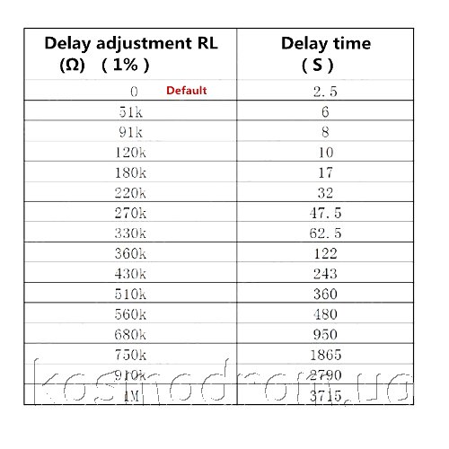 Время задержки выходного сигнала регулируется заменой SMD резистора в диапазоне: 2,5сек...1час.
