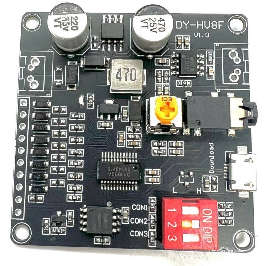 Фото может отличаться от реального вида предмета, но это не влияет на основные характеристики изделия | Отладочная плата MP3-DY-HV8F Умный голосовой модуль. Встроенный триггер ввода-вывода (I/O), управление протоколом UART. Питание 6-35 В. 4 Ом/20 Вт или 8 Ом/10 Вт