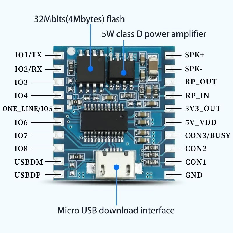Фото может отличаться от реального вида предмета, но это не влияет на основные характеристики изделия | Отладочная плата MP3-DY-SV19R Модуль для воспроизведения аудиофайлов: MP3, WAV, 2.54, 23mm x 26mm. weight: 2g
