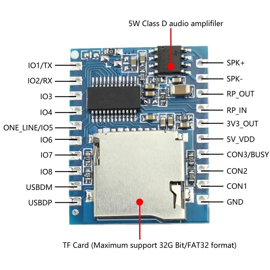 Фото может отличаться от реального вида предмета, но это не влияет на основные характеристики изделия | Отладочная плата MP3-DY-SV19T Модуль воспроизведения аудиофайлов: MP3,WAV,85?дБ,microSD,DC 3.7V–5V