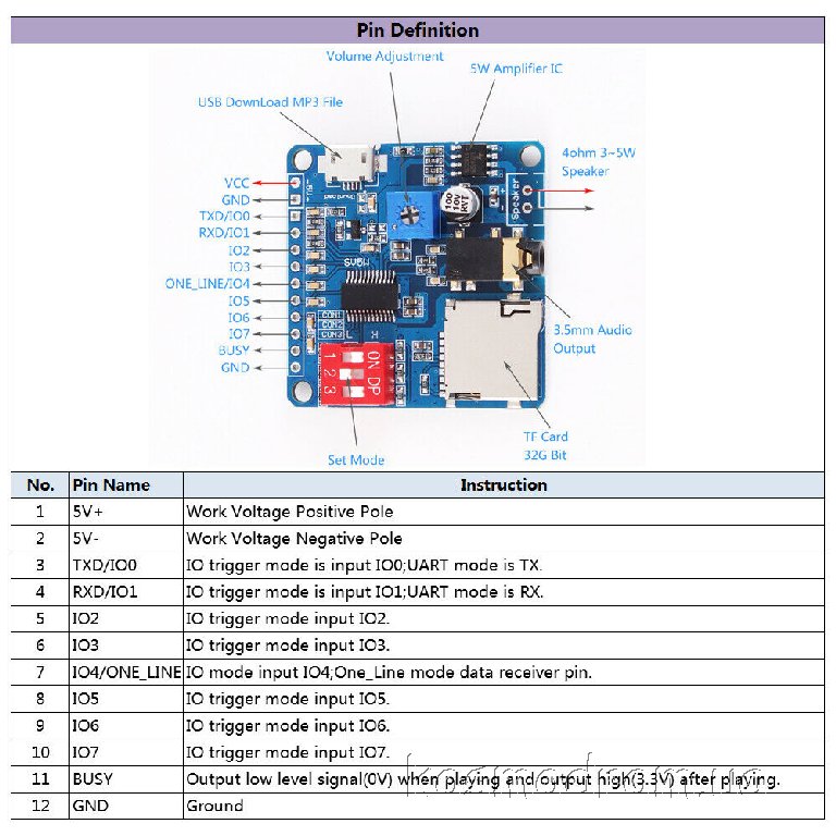 Фото может отличаться от реального вида предмета, но это не влияет на основные характеристики изделия | Отладочная плата MP3-DY-SV5W Умный голосовой модуль. Встроенный триггер ввода-вывода (I/O), управление протоколом UART. TF card 32G