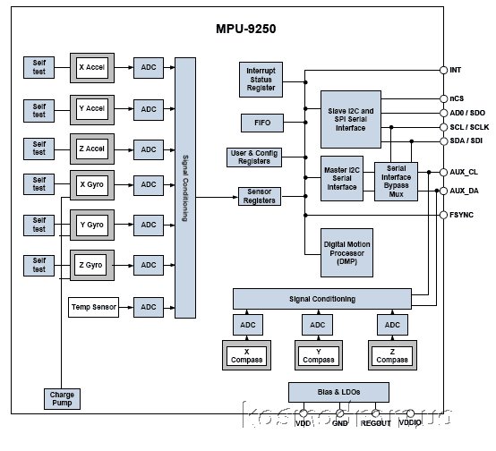 В корпусе микросхемы объединены два кристалла: на одном размещён трёхосевой гироскоп и трёхосевой сенсор, а на втором – также трёхосевой магнитометр Asahi Kaisei Microdevices. Данные с сенсоров оцифровываются 16-битными АЦП, обрабатываются с применением алгоритмов Motion Fusion сигнальным процессором DMP (Digital Motion Processor) и передаются внешнему микроконтроллеру по шине I2C/SPI.