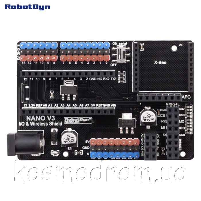 Фото может отличаться от реального вида предмета, но это не влияет на основные характеристики изделия | Отладочная плата Nano V3.0 I/O & Wireless Shield nRF24L01 Плата расширения для Arduino Nano V3.0, I/O c возможностью подключения беспроводных модулей xBee, nRF24, ESP2866, APC.