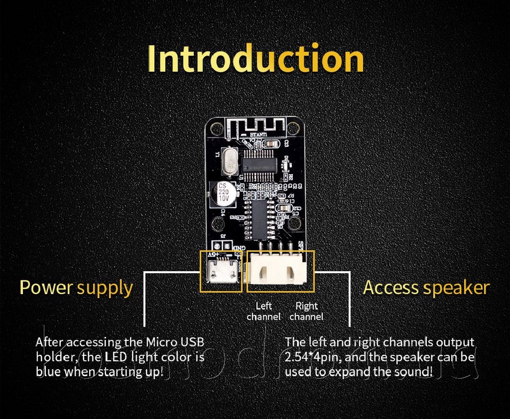 Модуль Bluetooth усилителя подойдет для самостоятельного изготовления портативных колонок, поддерживает подключение по Bluetooth к любым аудио девайсам. Питание осуществляется по интерфейсу MicroUSB.