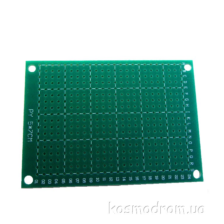 Макетная плата, односторонняя, без металлизации отверстий, размеры 50х70 мм. Цвет маски зелёный. Шаг 2,54 мм.